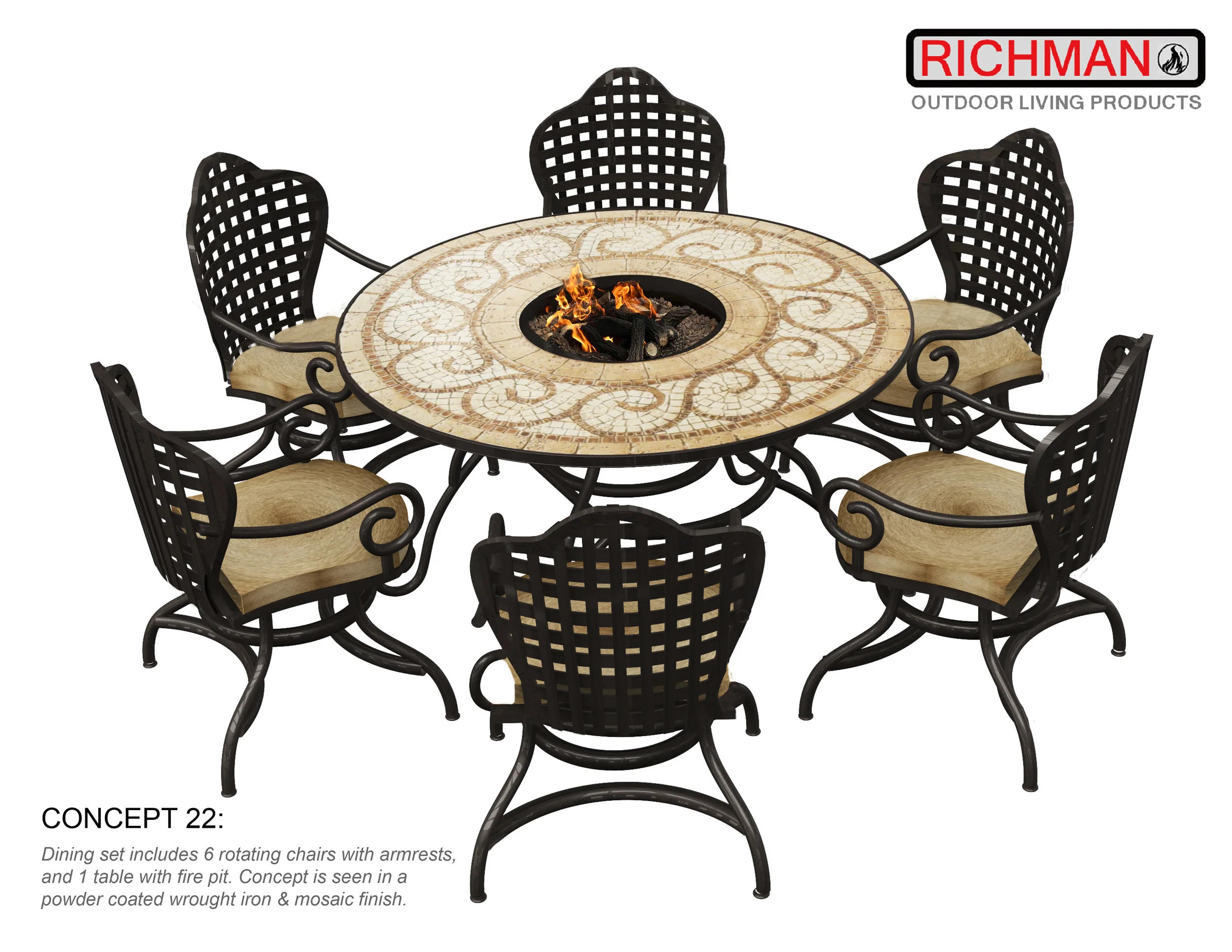 Multiple portfolio samples of outdoor patio furniture & accessories. Samples include outdoor fire pits, bistro sets, dining sets, storage benches, 4 & 5 piece conversation sets.